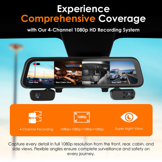 UZIVO U44 4-Channel Mirror Dash Cam, 12” Touch Screen, 1080p, 170° Wide Angle, Stream Media, Auto-Backup Camera for Car, Truck, Taxi, Parking Monitor, Night Vision,FREE 128GB Card